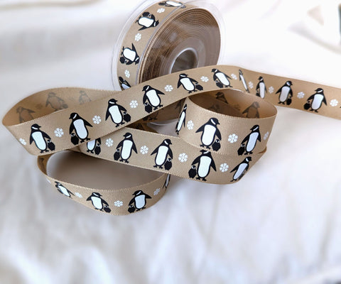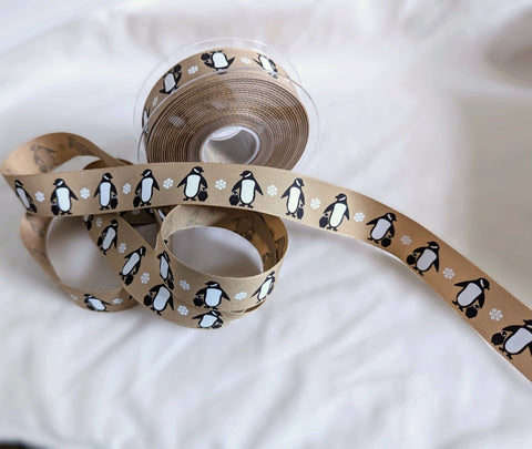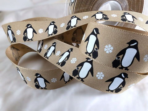 • Berisfords "Penguins" with Snowflakes Printed Rustic Taffeta (Christmas) Ribbon. Part of the Natural Charms Range.