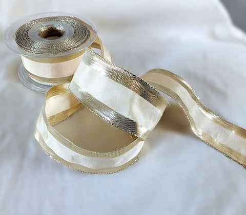 Good quality woven cream polyester ribbon with metallic gold lurex borders and wired on both edges. Made in the UK by Berisfords Ribbons.