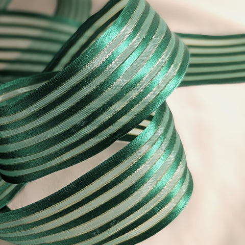 Double face hunter green polyester satin and translucent sheer organza with thin metallic pale gold lurex stripes. Wire edge on both borders.