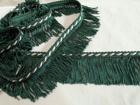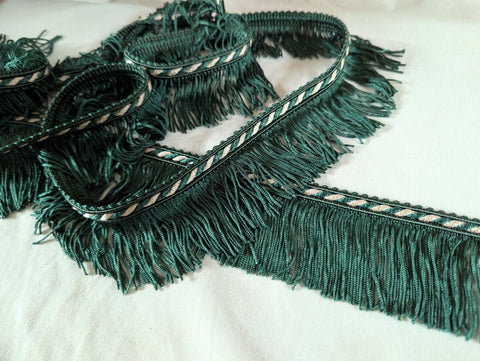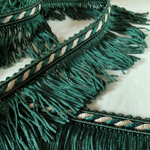 Fringing | 50mm Fringe Trim on a Corded Braid | Dark Green & Pearl