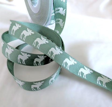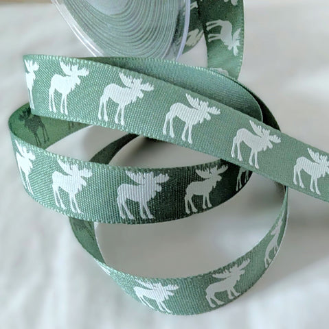 Rustic polyester taffeta ribbon with a cotton feel and appearance. Top quality and made in the UK by Berisfords Ribbons 1.5cm width, cedar green with a natural white reindeer Scandinavian style festive print.