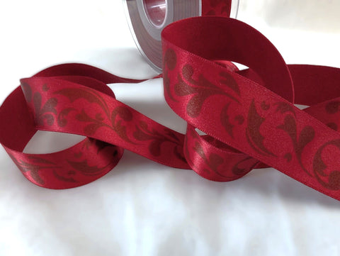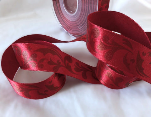 25mm wide quality polyester satin ribbon with a braid like heavier weave. Scarlet berry red with a satin sheen and tonal darker leafy baroque-style print. The reverse a contrasting rustic matt.