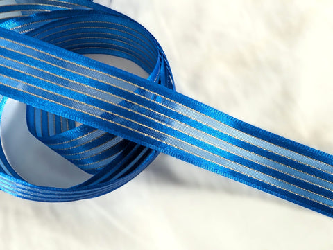 Double face royal blue polyester satin, translucent sheer organza and thin metallic gold lurex stripes